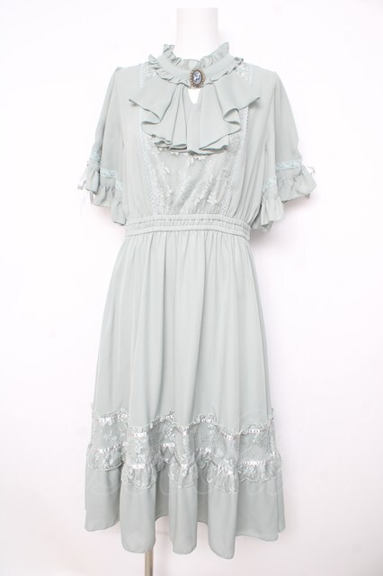 axes femme / カメオ付フレア袖ワンピース グリーン Y-26-02-21-116-AX-OP-SZ-ZY