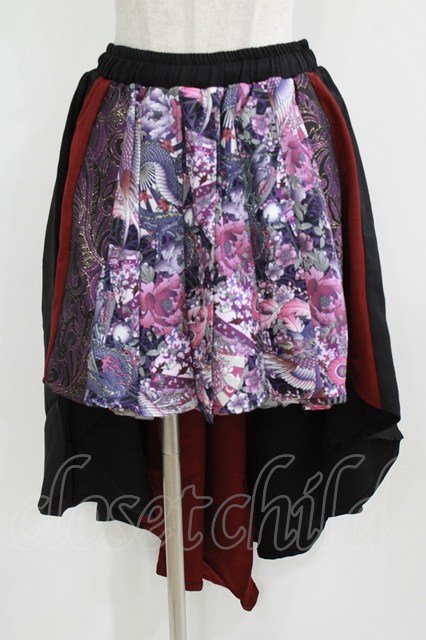 Qutie Frash / 和柄プリーツスカート 黒×赤×紫 H-26-03-02-026-QU-SK-KB-ZH