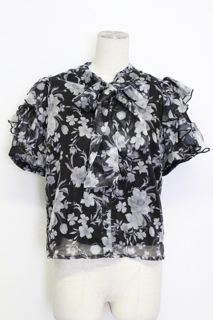 evelyn / フラワーハイネックリボンタイ半袖ブラウス 黒Xグレー T-26-03-15-014-LO-BL-SA-ZT