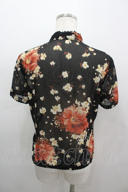 INGEBORG / チャイナボタンフラワーシフォン半袖ブラウス S ブラック I-26-03-12-020-LO-BL-SA-ZI