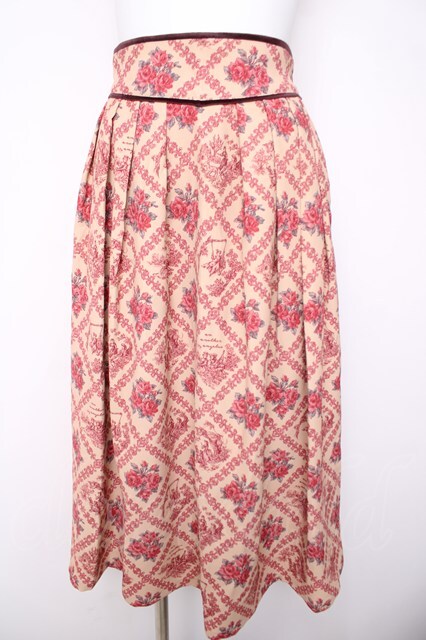 an another angelus / ヴィンテージローズタイツ柄タックスカート ベージュ×レッド Y-26-04-03-178-CA-SK-SZ-ZY
