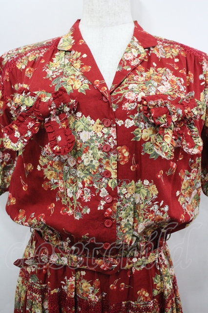 PINK HOUSE / チェリーブーケ柄スモッキング刺繍開襟ワンピース 赤 I-26-04-06-076-LO-OP-TE-ZI [戻る]