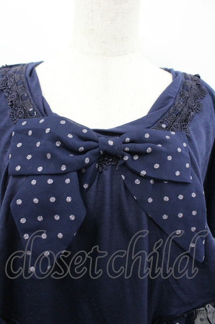 axes femme / ラメドットリボンフリル半袖カットソー ネイビー I-26-04-10-123-AX-TO-SA-ZI