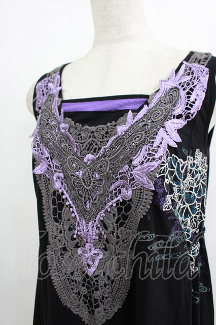 Ozz oneste / ヨークレース刺繍プリントチュニック 黒 H-25-10-08-1042-OO-TO-KB-ZH