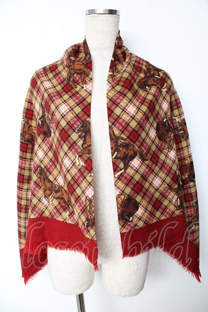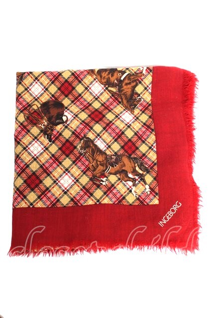 INGEBORG / 馬とチェックのストール 赤 Y-25-10-10-015-LO-ZA-SZ-ZY