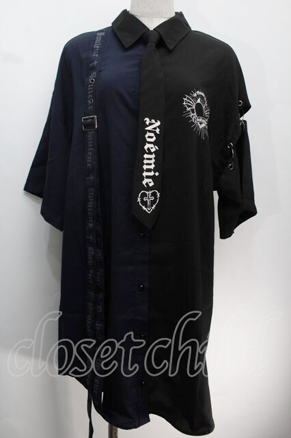 NOEMIE / ネクタイ付き5分袖配色ブラウス 黒x紺 S-25-10-14-019-LO-BL-HR-ZS [2100020000032726-S-25-10-14-019-LO-BL-HR-ZS]