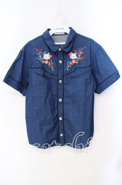 Candy Stripper / ねこ刺繍デニム風ブラウス インディゴ O-25-10-25-059-PU-BL-IG-OS