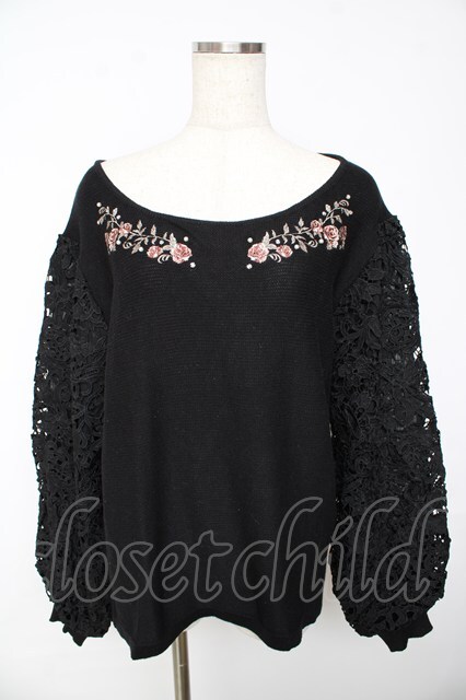 axes femme / 袖レース刺繍デザインニット L 黒 Y-25-11-01-055-AX-TO-SZ-ZY