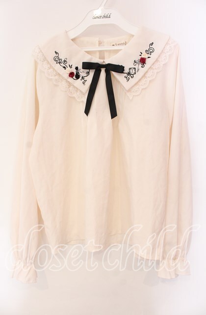 axes femme / リボン付き猫刺繍ブラウスプルオーバー オフ O-25-10-30-069-AX-BL-IG-OS