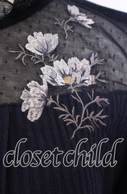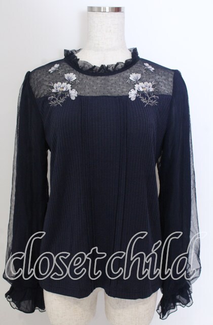 axes femme / 襟チュールフラワー刺繍トップス M ネイビー O-25-10-30-1087-AX-TO-IG-OS