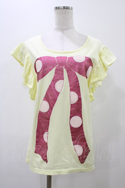 Emily Temple cute / ドットリボンプリントフリルノースリーブカットソー イエロー H-25-11-19-1030-ET-TO-KB-ZH