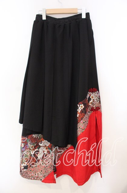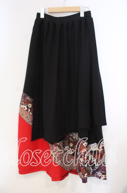 Qutie Frash / シフォンラップ和柄ロングスカート ブラック×レッド O-25-11-14-019-QU-SK-OW-OS