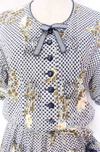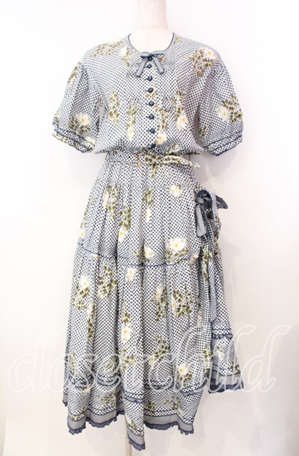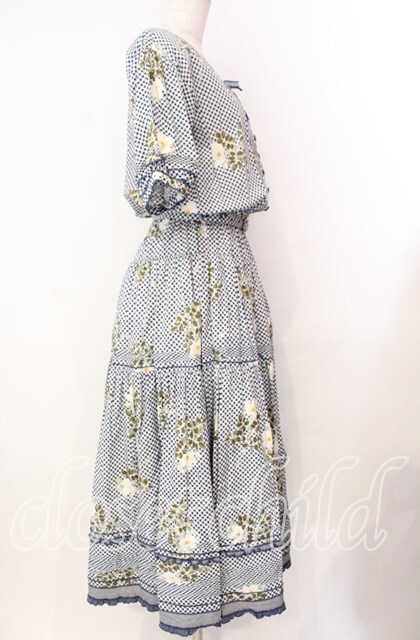 WONDERFUL WORLD / チェックフラワーたくし上げワンピース シロ×ネイビー O-25-11-17-038-LO-OP-IG-OS