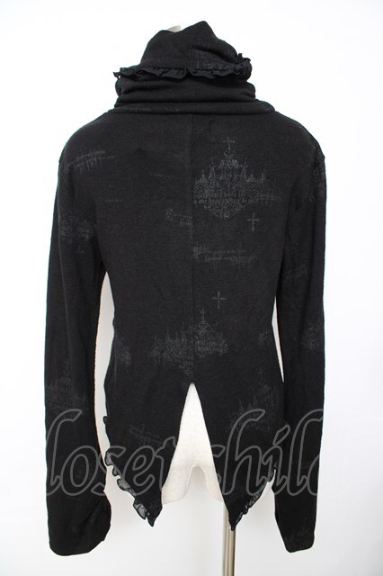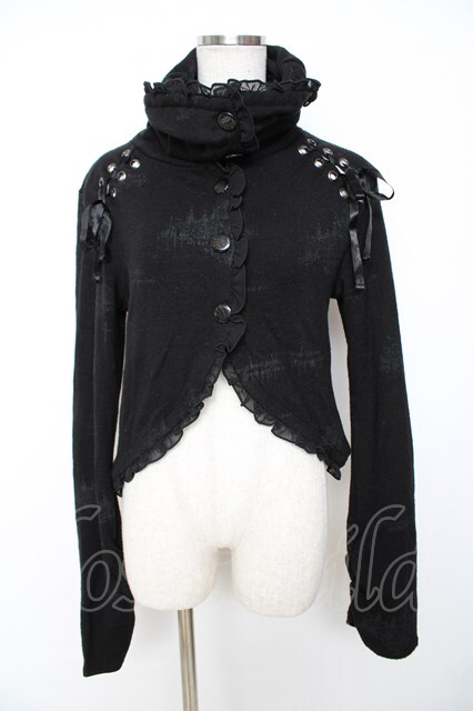 h.naoto Blood / プリント入り編み上げハイネック燕尾カーディガン 黒 Y-25-11-22-110-HN-TO-SZ-ZY
