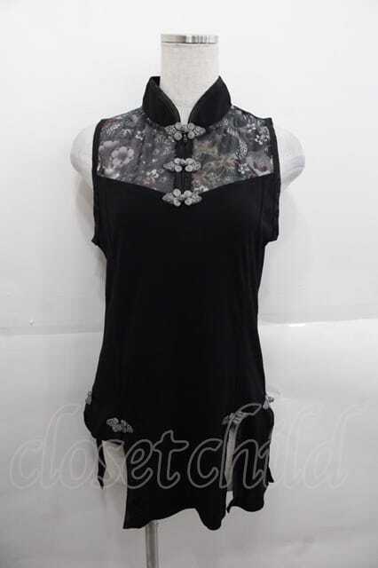 Qutie Frash / 和柄メッシュ切替チャイナノースリーブトップス 黒 I-25-11-18-014-QU-TO-SA-ZI