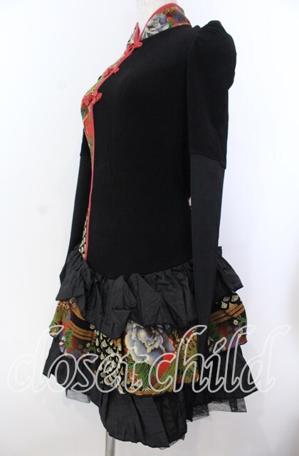 Qutie Frash / ちりめん和柄パフワンピース ブラック O-25-11-19-030-QU-OP-IG-OS