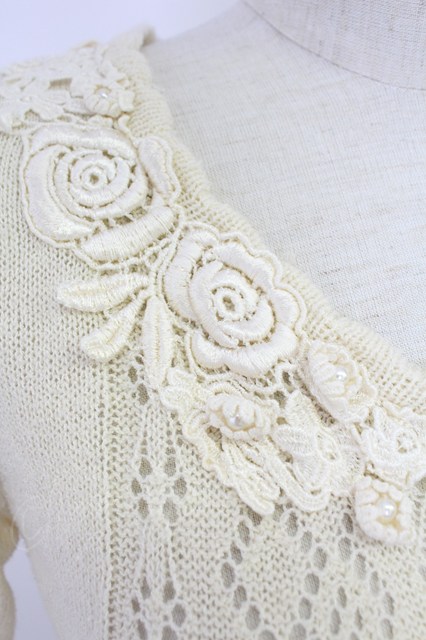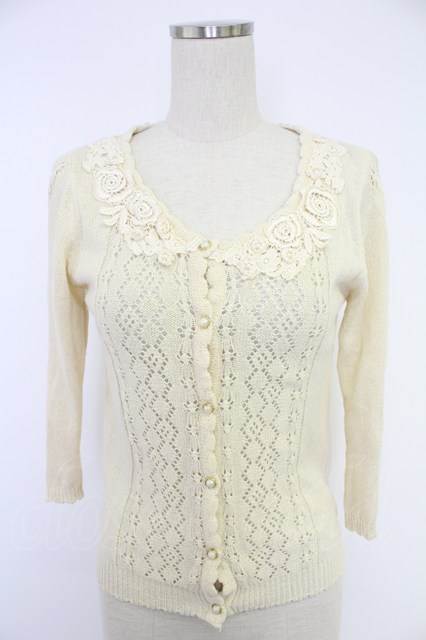 axes femme / モチーフレース襟透かし編みカーデ M キナリ T-25-12-03-007-AX-TO-SA-ZT
