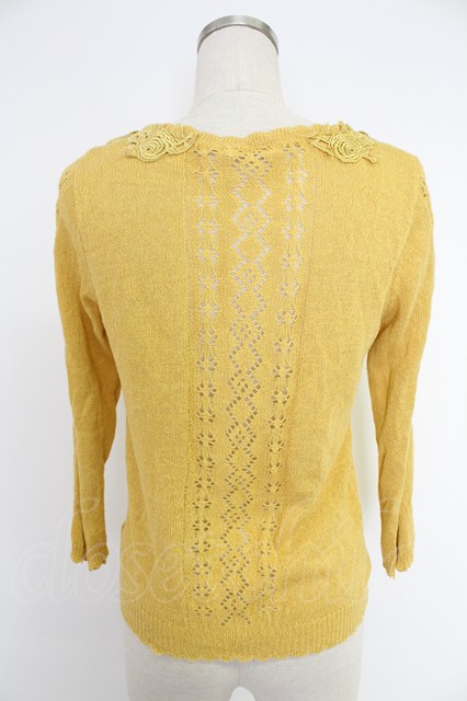 axes femme / モチーフレース襟透かし編みカーデ M カラシ T-25-12-03-014-AX-TO-SA-ZT