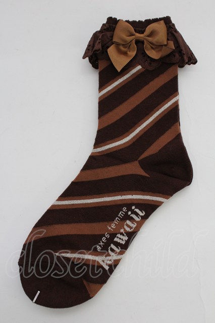 axes femme kawaii / ストライプクルー丈ソックス ブラウン T-25-12-04-001-AX-ZA-SA-ZT