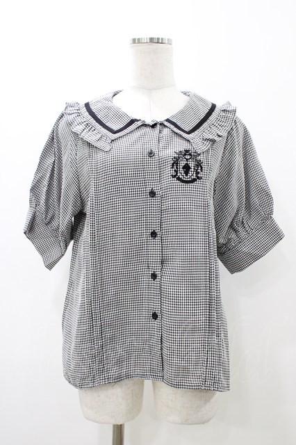 NieR Clothing / エンブレム刺繍ギンガムパフブラウス ブラック H-25-12-12-041-PU-BL-KB-ZH