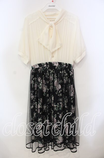 axes femme / リボン付レイヤード花柄ワンピース アイボリー×クロ O-25-12-06-063-AX-OP-IG-OS