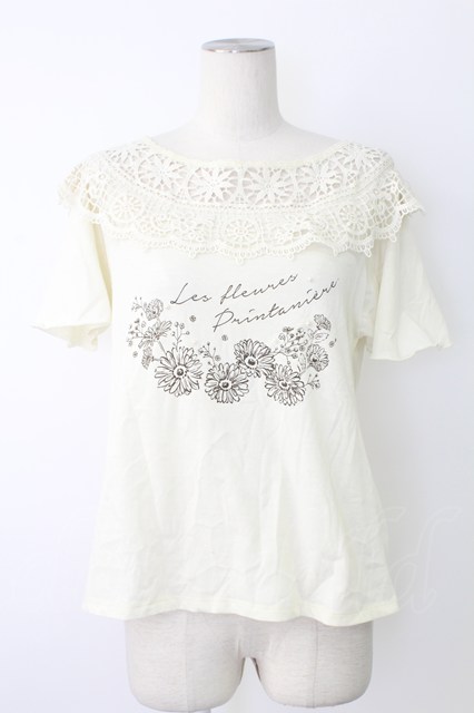 axes femme / 肩レースプリントTシャツ アイボリー T-25-12-17-006-AX-TO-SA-ZT