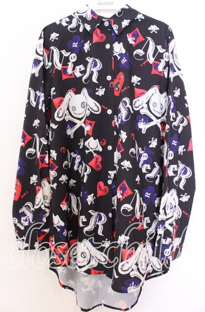 NieR Clothing / ニーアちゃん&トランプ総柄シャツ L ブラック O-25-12-10-049-PU-BL-YM-OS