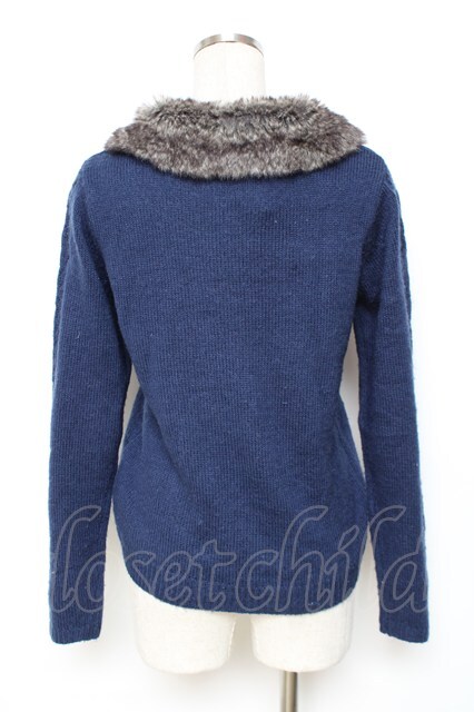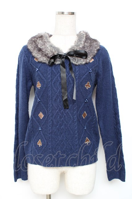 axes femme / トランプアイコン刺繍ファーカラーニット M 紺 Y-25-12-11-016-AX-TO-SZ-ZY