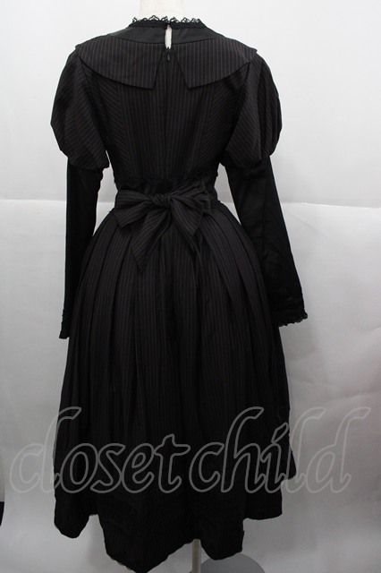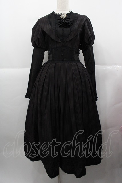 Faeriesdaffodil(海外ロリータブランド) / パールビジューフリルブローチ付きストライプ長袖ワンピース S 黒Xブラウン I-25-12-13-100-LO-OP-SA-ZI [2100060000044381-I-25-12-13-100-LO-OP-SA-ZI]