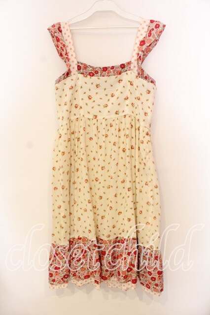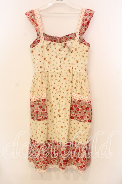 Jane Marple / リバティプリントのエプロン風ワンピース アイボリー×ピンク O-25-12-20-057-JM-OP-IG-OS