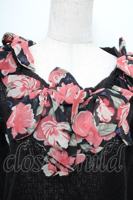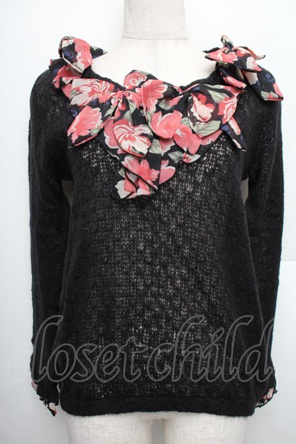 axes femme / 花柄リボンニット 黒 S-25-12-21-051-AX-TO-HR-ZS