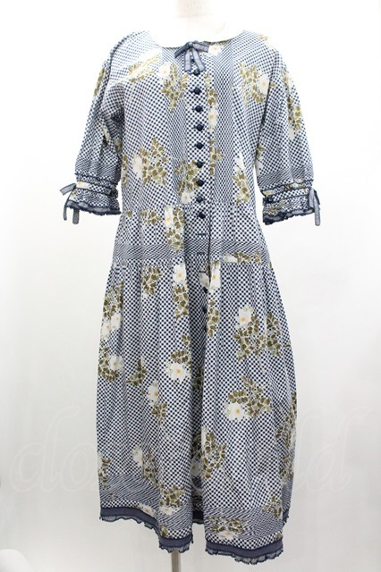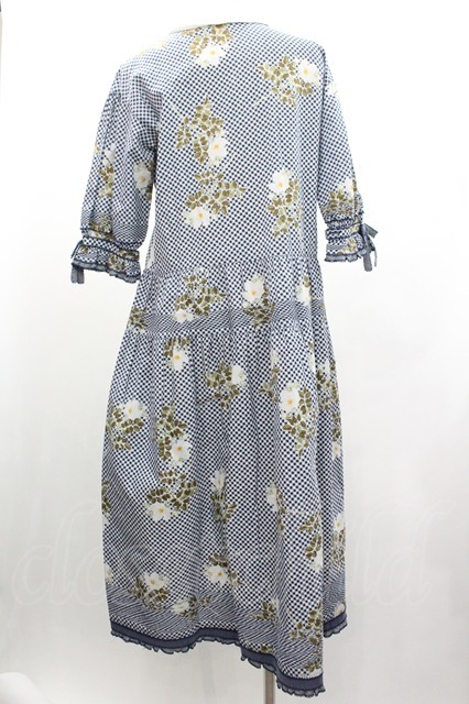WONDERFUL WORLD / チェックフラワー柄半袖ワンピース ネイビーX白 I-26-01-04-040-LO-OP-SA-ZI [2100060000048629-I-26-01-04-040-LO-OP-SA-ZI]