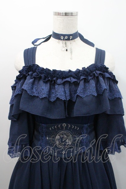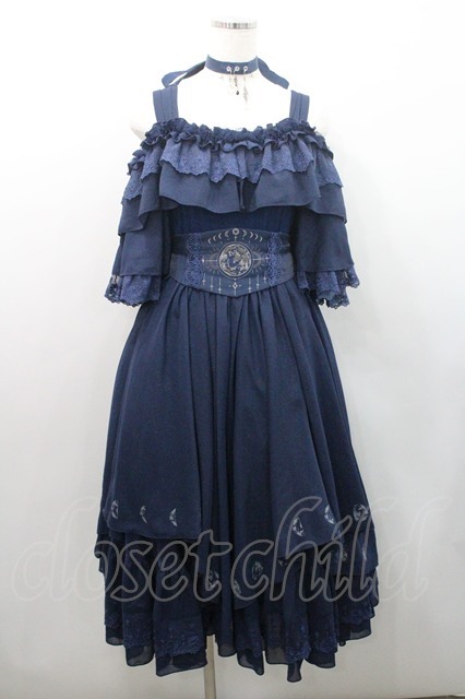 Hoshibako Works / 月の満ち欠けオフショルダードレッシーワンピース&刺繍ベルト&チョーカーセット ネイビー I-26-01-08-071-LO-OP-SA-ZI