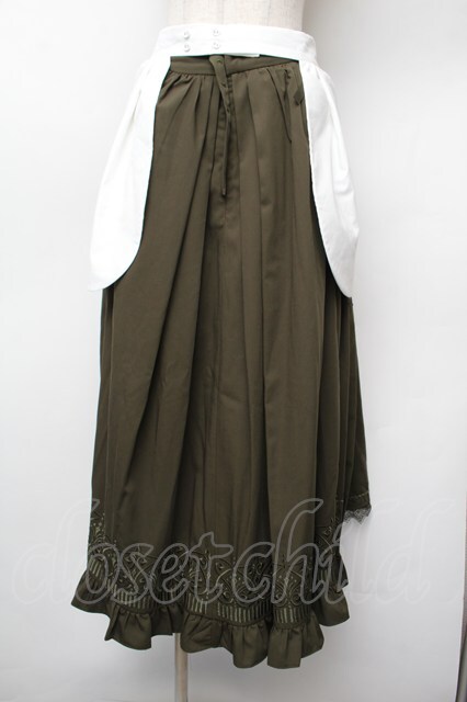 中国ロリータ / エプロン付き裾刺繍ロングスカート カーキx白 S-26-01-10-065-LO-SK-HR-ZS