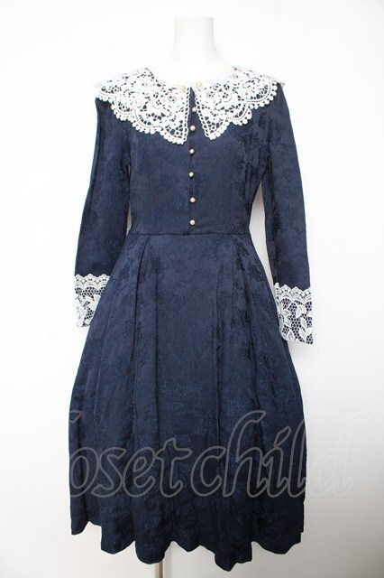 axes femme NOSTALGIE / レース襟付ジャガードワンピース M 紺 Y-26-02-05-090-AX-OP-SZ-ZY