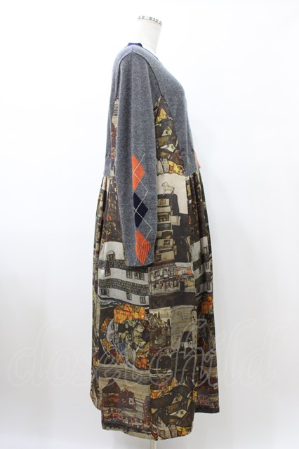 Jane Marple Dans Le Salon / Schiele's landscapesトロンプルイユドレス サンドベージュ×ミックスグレー H-26-02-08-1031-JM-OP-KB-ZH