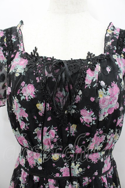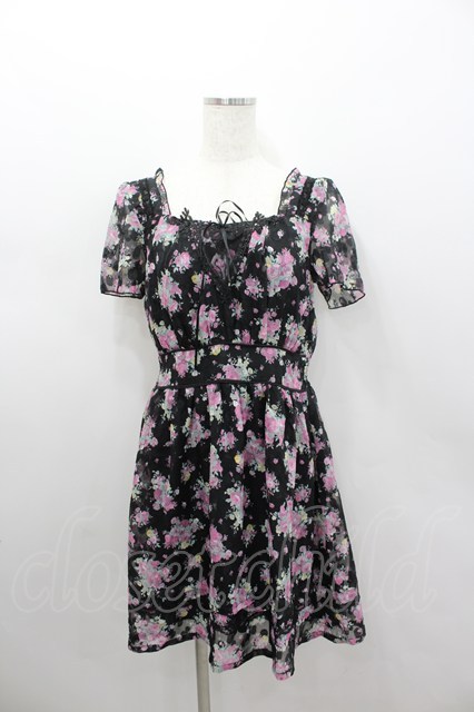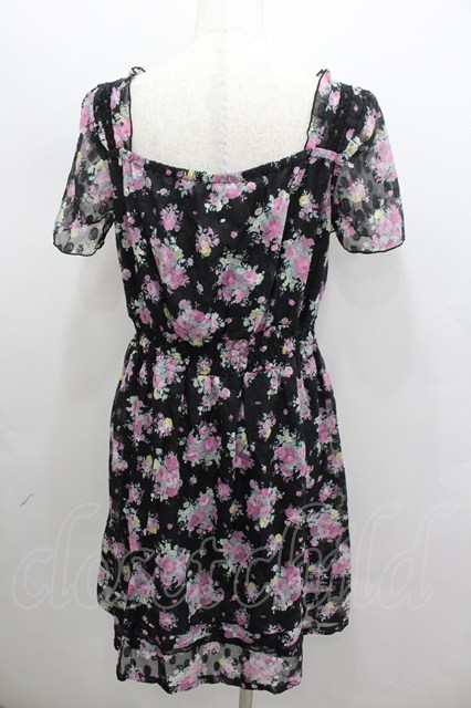 axes femme / 薔薇ブーケプリントシフォン半袖ワンピース 黒Xピンク I-26-02-11-118-AX-OP-SA-ZI