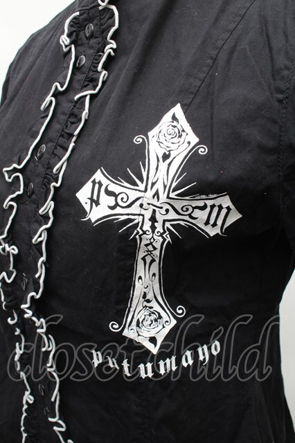 PUTUMAYO / 立ち襟クロスプリント半袖ブラウス 黒x白 S-26-02-11-038-PT-BL-HR-ZS [2100020000037828-S-26-02-11-038-PT-BL-HR-ZS]