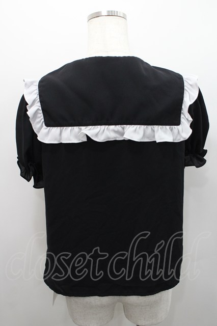 Jamie エーエヌケー / スクエアフリル襟半袖ブラウス 黒X白 I-26-02-15-049-LO-BL-SA-ZI