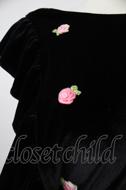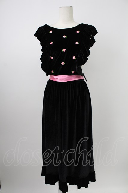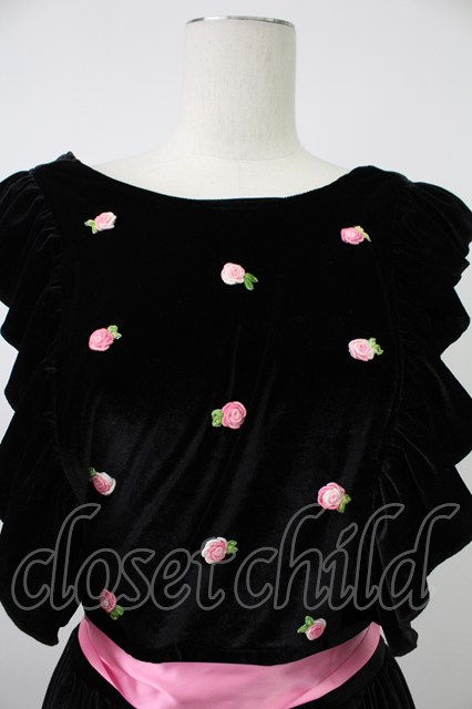 Nile Perch / ミニローズ柄ベルベットジャンパースカート 黒xピンク T-26-02-18-016-LO-OP-SA-ZT
