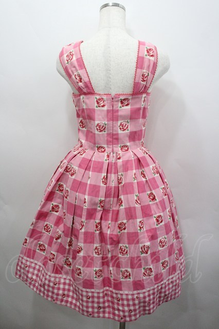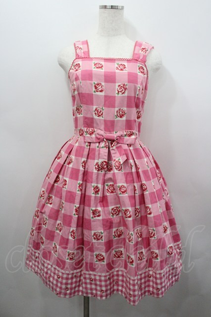 Emily Temple cute / ブロックチェックバラプリントジャンパースカート ピンク I-26-02-23-038-ET-OP-TE-ZI