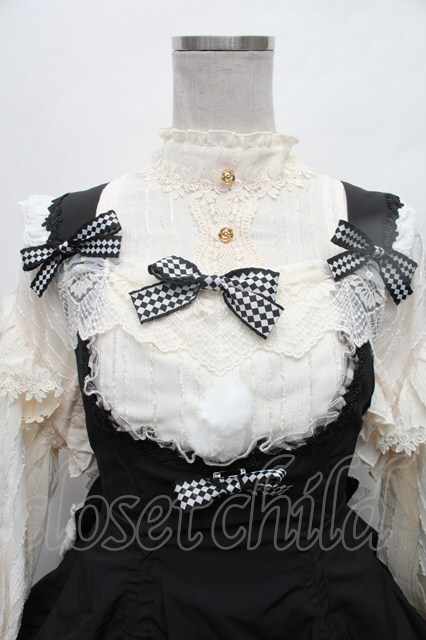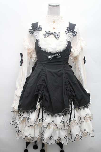 中国ロリータ / 裾レースシャーリングジャンパースカートセット 黒x白xキナリ S-26-02-28-044-LO-BL-HR-ZS