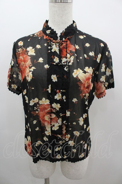 INGEBORG / チャイナボタンフラワーシフォン半袖ブラウス S ブラック I-26-03-12-020-LO-BL-SA-ZI [2100060000051342-I-26-03-12-020-LO-BL-SA-ZI]