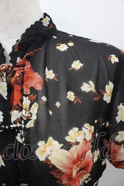 INGEBORG / チャイナボタンフラワーシフォン半袖ブラウス S ブラック I-26-03-12-020-LO-BL-SA-ZI