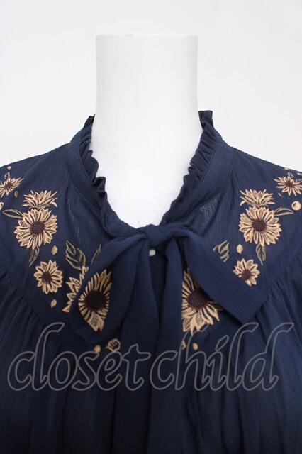 axes femme / ひまわり刺繍楊柳ブラウス M 紺 Y-26-03-18-011-AX-BL-SZ-ZY