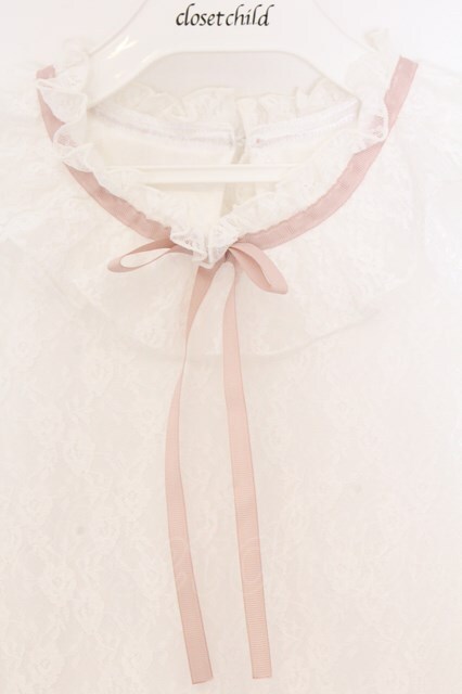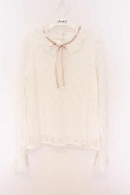 DearMyLove / フリルネックレーストップス M シロ×ピンクリボン O-26-04-05-053-EL-TO-OW-OS