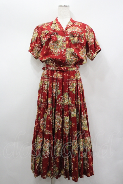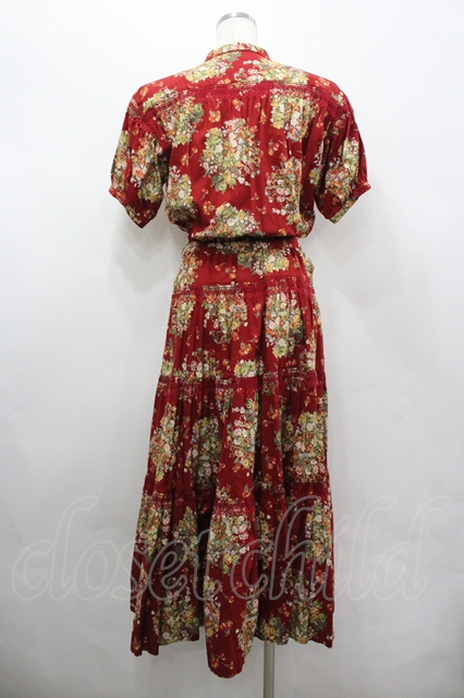 PINK HOUSE / チェリーブーケ柄スモッキング刺繍開襟ワンピース 赤 I-26-04-06-076-LO-OP-TE-ZI