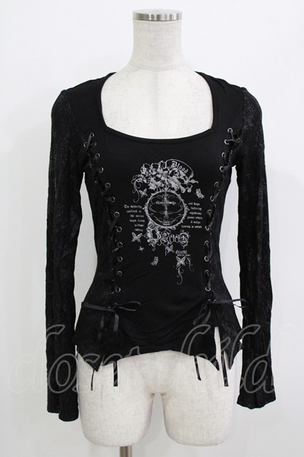 h.NAOTO / プリント切替レースアップカットソー ブラック H-26-04-14-052-HN-TO-KB-ZH