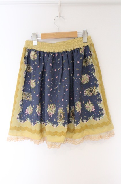 axes femme / 鳥かご×メルヘン柄スカート ネイビー×イエロー O-26-04-10-040-AX-SK-IG-OS
