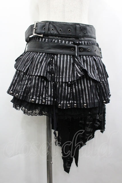 SEX POT ReVeNGe / ダメージフラップストライプフリルミニスカート 黒×シルバー I-26-04-10-075-SP-SK-TE-ZI